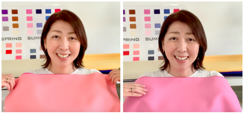 左側のスプリングのピンクの布を当てたほうが、明るく華やかな印象に見えませんか?