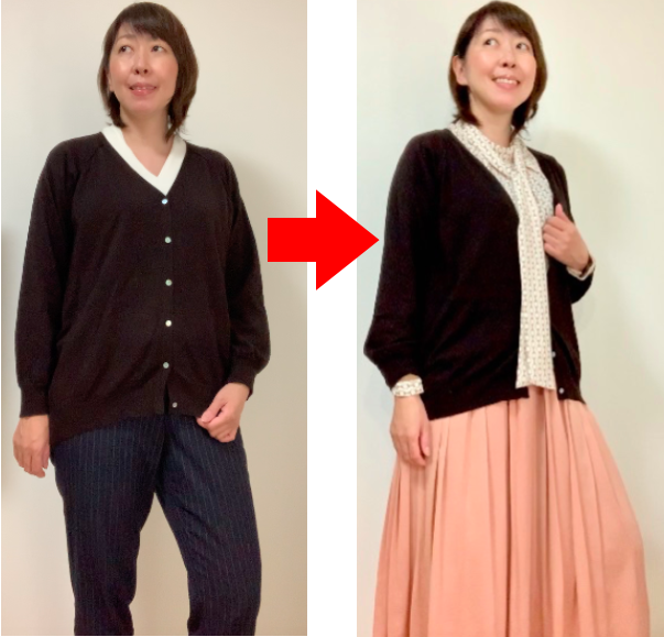 パーソナルカラーをブラウスにも取り入れているのはもちろんですが、実はカーディガンのボタンを大部分開けたり、ブラウスのタイをあえて外に出すことで、ブラウスの明るい色の露出面積を広げています。