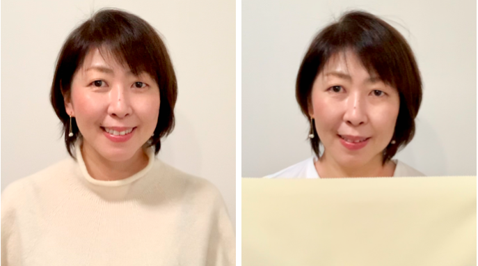 反対に右の真っ白なシャツを着ている方は、お肌がくすんで見えますね。