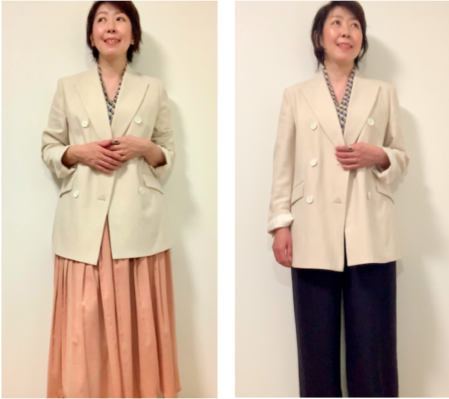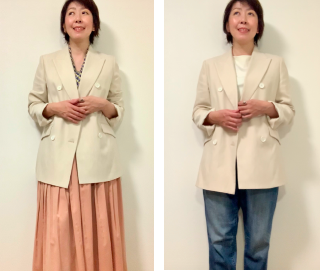 今回イエベ・スプリングの私に似合うアイボリーのジャケットを選びましたが、明るめのベージュでも素敵です。