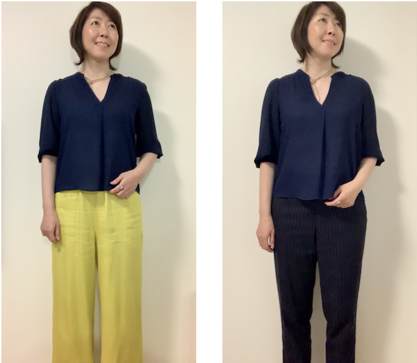 今回は、ビジネスシーンにも着回しがきくネイビーのブラウスにカラーパンツを合わせて検証しました。