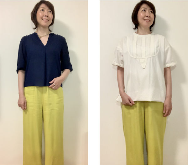 今回は黄色のカラーパンツで検証していますが、ブルベ・サマーやウィンターの方は黄色は避けましょう。
