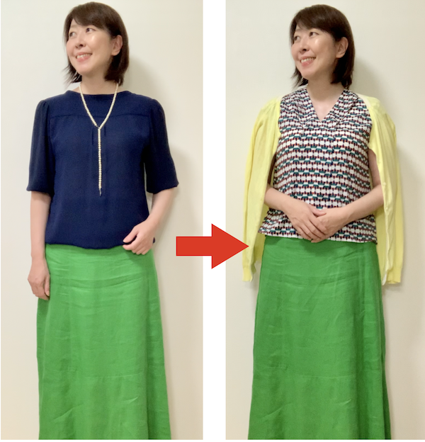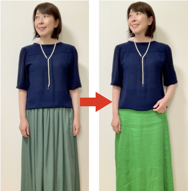 今回着ているトップスは、鮮やかさがあるネイビーのブラウスで、イエベ春の私に似合う色になりますが、スカートの色を変えてみました。