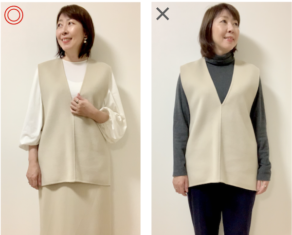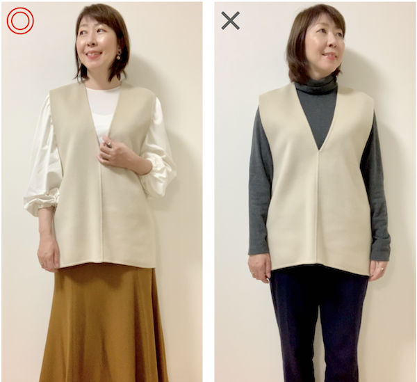 ×の画像は、大半が似合わない色を合わせていることから、明らかに印象を悪くしてしまい、何より垢抜けないということになります。