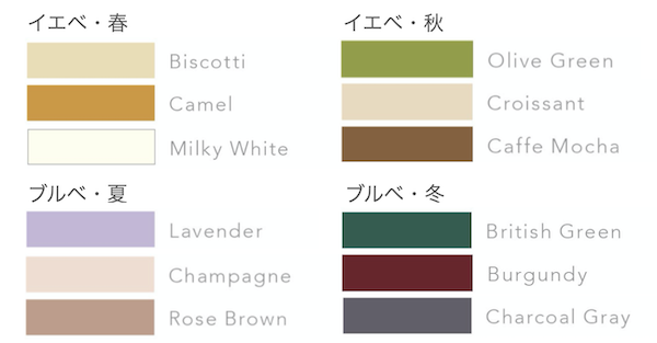 下記の画像が、パーソナルカラー別の秋冬におすすめの色になります。