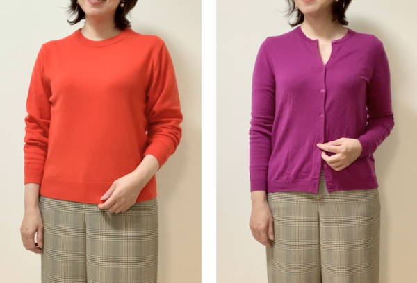 反対に左側のトップスは、青みが入ったパープル系でブルベの色。