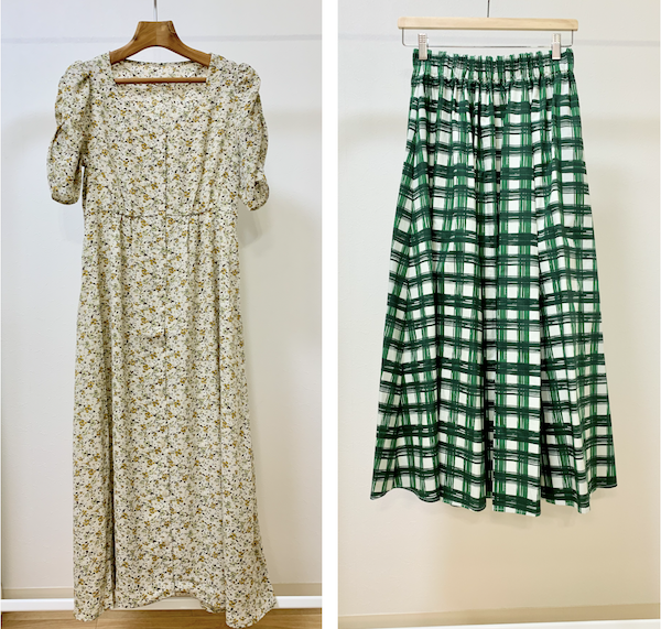 骨格ウェーブの方は、下記画像の左のワンピースのような小花柄や小さなドット柄など、小さく控えめな柄の方がとてもよくフィットしますのでおすすめです。