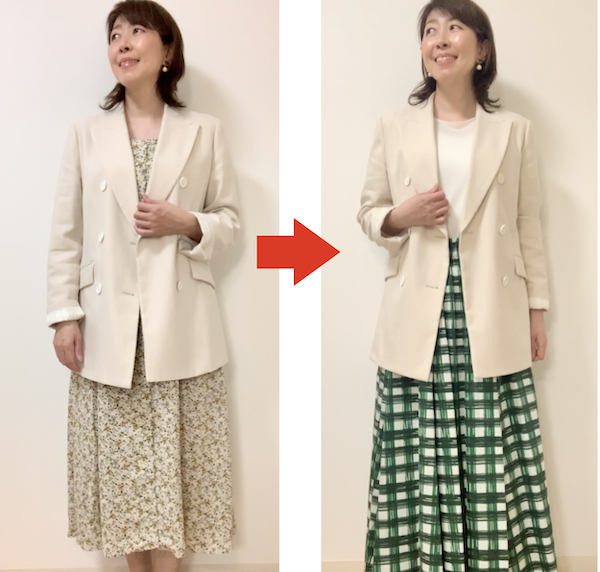 左側の小花柄のワンピースの方は、なんとなくパッとみた印象が垢抜けない感じで、全体的に締まりがなく膨張して見える感じもします。
