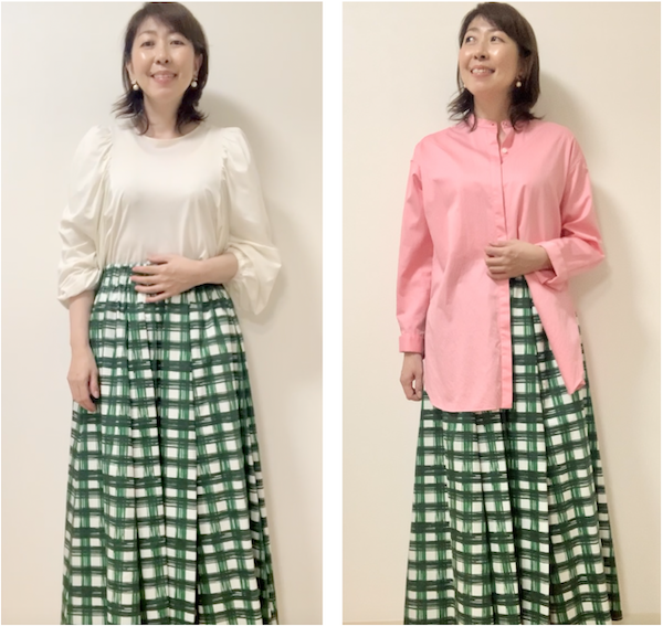 右側のグリーンのチェック柄スカートの方が、オシャレで垢抜けて見えますよね。