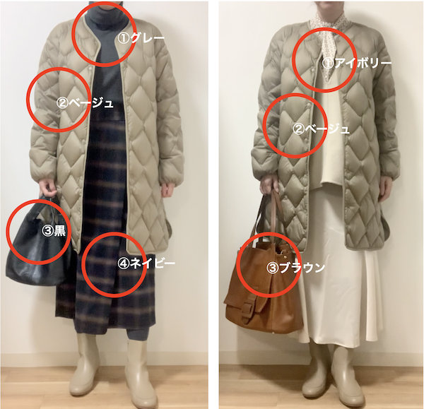 ダウンコートやキルティングコートを着る場合、着痩せするならダークな色と思いがちですが、明るい色のコートでもトップスから靴まで同系色でまとめると、着痩せ効果も期待できますよ!