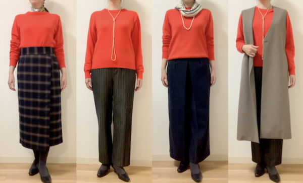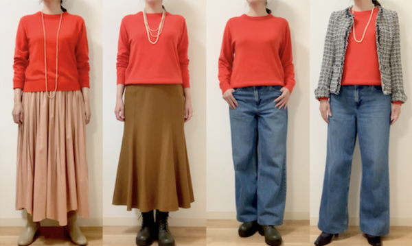今回は赤いニットを例に、着回しコーデをいくつか作り置きしましたのでご紹介します。