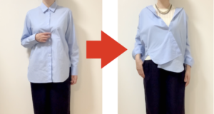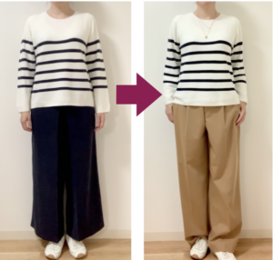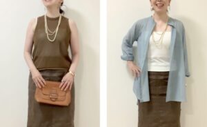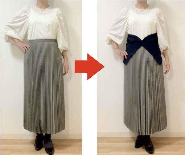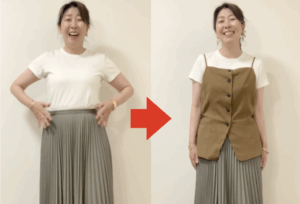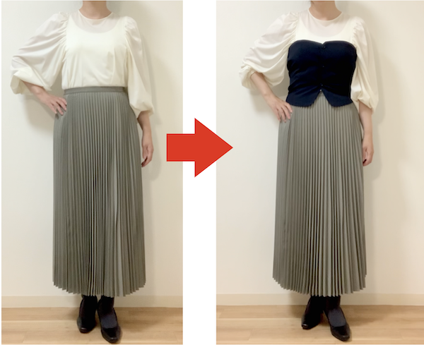 右側のビスチェがプラスされた画像の方が、コーディネートにメリハリも出て、おしゃれ度もアップしていますよね!