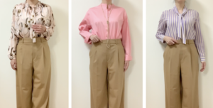 そしてこちらは、シアー素材のボリュームブラウスとワイドパンツのコーディネート。