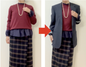 でも下の左の画像のように、一枚で着るとどこか平凡で垢抜けない・・・