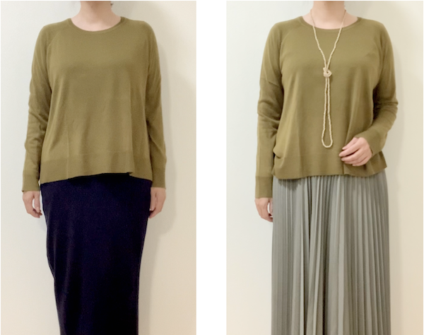 左のネイビーのタイトスカートを合わせている方も悪くはないのですが、今回使用しているニットが明るめのカーキ色なので、ネイビーが重たく、相性があまり良くありません。