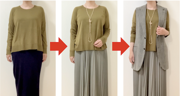 右のプリーツスカートは黄色みのあるグレー系なので、黄色みのあるカーキのニットと調和が取れることで好印象に見せることができます。