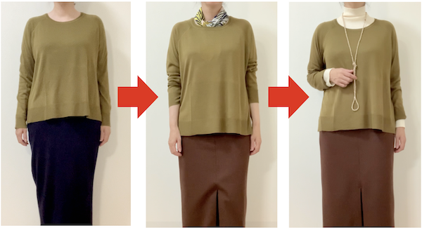 今回のようなクルーネックのニットは、一枚で着ると首元が寂しくなることも。