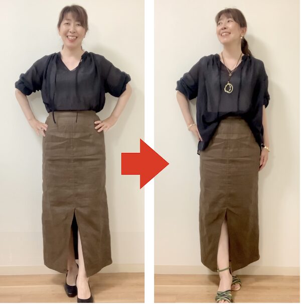 ②足元を黒のパンプスからグリーン系のサンダルに変えました。