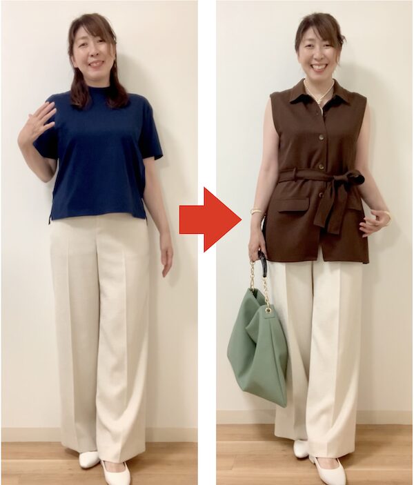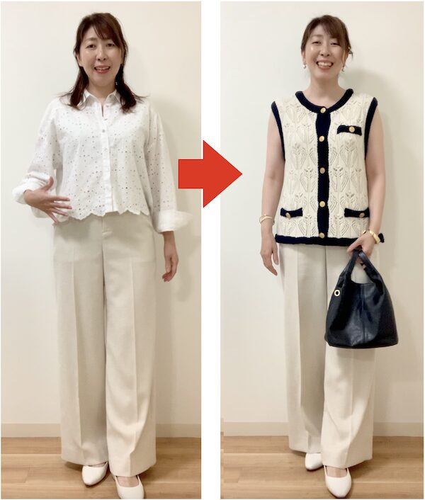 今度は、パンツと同じアイボリーカラーのニットベストを合わせました。