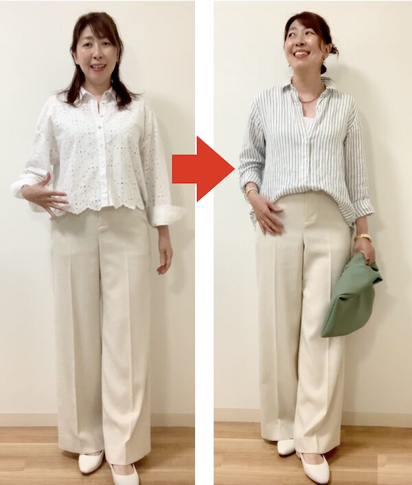 今度は、アイボリーのパンツと同系色の白のトップスと合わせてみます。